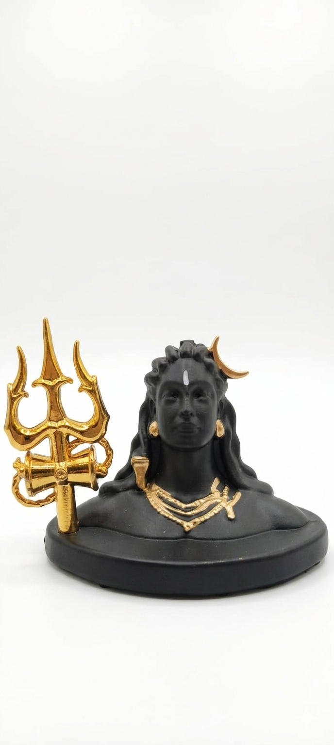 Feature Details Product Name Lord Shiva Bust Statue with Golden Trishul Material Premium Quality Resin Finish Matte Black with Golden Detailing Color Black & Gold Design Type Bust Style (Upper Body) Placement Table Top / Shelf / Mandir Use Home Decor, Temple, Office, Gifting Package Includes 1 x Lord Shiva Statue Weight 150 grams Care Instructions Dry Cloth Cleaning Only Country of Origin India Dimensions